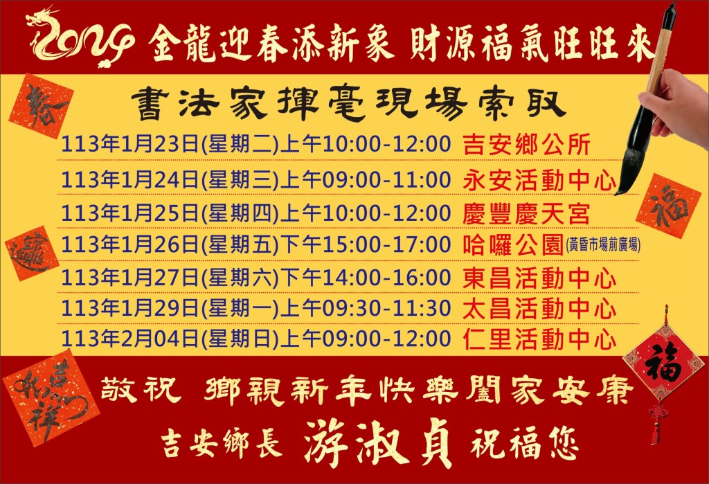 金龍報喜!農曆春節將近,花蓮縣吉安鄉公所與書法學會、洄瀾詩社,再次攜手舉辦鄉內七場次「2024金龍迎春添新象 財源福氣旺旺來」書法家現場揮毫贈春聯活動,首場於1月23日上午10時起在鄉公所門口開跑,書法名家們將現場揮毫百幅喜慶春聯;游淑貞鄉長邀約鄉親們可到七處社區,索取每場次不同名家墨寶文粹,為家裡貼春聯換新妝增添濃厚年節氣氛。