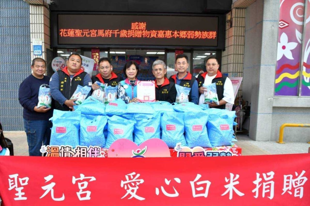 花蓮聖元壇馬府千歲與吉安鄉公所牽起社會關懷善緣,聖元壇集四方力量捐贈400公斤白米給鄉公所物資捐贈平台,1月15日下午在公所前廣場發放給勝安、宜昌、北昌、南昌、吉安等村200個弱勢家戶,鄉長游淑貞親頒感謝狀致意,也感謝長期以來宮廟、社團、企業及善心民眾攜手與公所共構溫情家園。