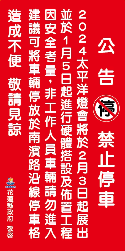 為了籌備燈會活動,太平洋公園已如火如荼的進場佈展中,為確保人車通行安全,從即日起至燈會活動結束完成撤場為止,太平洋公園南濱段鄰近南濱路(193縣道)的南北側出入口封閉並設置圍籬;至於南濱路面對和平路的太平洋公園大門也封閉禁止汽車進入,敬請各位鄉親及遊客見諒並配合管制措施。