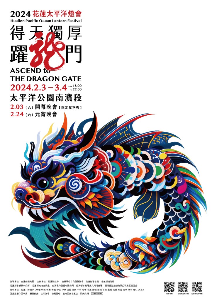 全臺最有年味的「花蓮太平洋燈會」將於2月3日至3月4日(除夕休)在花蓮太平洋公園南濱段閃耀登場。今年龍年燈會將以鯉躍龍門、鰲魚化龍等各種龍的意象與姿態演繹出花蓮動靜兼容的質感,結合掛滿縣內13鄉鎮市主要街道的近兩萬盞大紅燈籠,歡迎國內外遊客及返鄉遊子回到花蓮迎龍年、添喜氣、賀新春。