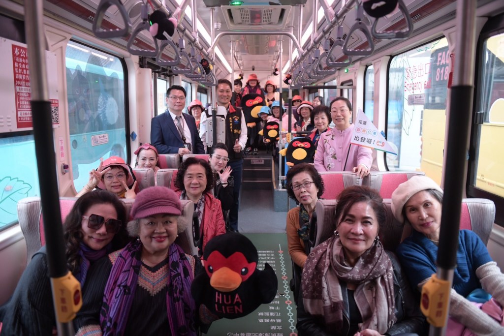 縣長徐榛蔚也特別感謝花蓮縣婦女經貿文化交流協會派員30人參加本次彩繪公車發表會,並在會後搭乘彩繪公車踩街,實際體驗彩繪公車搭乘的沉浸式感受。徐縣長說明,彩繪公車除了外觀顏色上提供清楚的識別度,特別以各路線深具特色的重要景點來設計圖示,讓民眾看圖就了解公車路線行經景點,也能以特色景點圖示確認搭乘公車路線的正確性。不僅如此,公車內部設計更是充滿巧思,讓搭乘公車的民眾能一踏上公車就充滿沉浸式感官體驗,如紅色峽谷線的太魯閣峽谷天空、黃色市區線的七星潭月光海、綠色縱谷線的鯉魚潭紅面鴨及藍色海岸線的礁岩長浪海灘。徐縣長說,公共運輸是花蓮鄉親及遊客重要的移動方式,彩繪公車無論是外觀及內部設計,都讓民眾沉浸在沿途的風景中漫遊花蓮美景。這次彩繪公車體驗活動品也是延續整體設計,雙肩背包讓民眾除了實用,也讓銀髮長輩騰出雙手握好站穩。包包跟帽子都有該色路線重要景點的圖示,還有QRCode可以掃描讓搭乘者隨時掌握知道即時公車動態,花蓮縣政府要讓民眾搭乘公車更時尚也更安心。