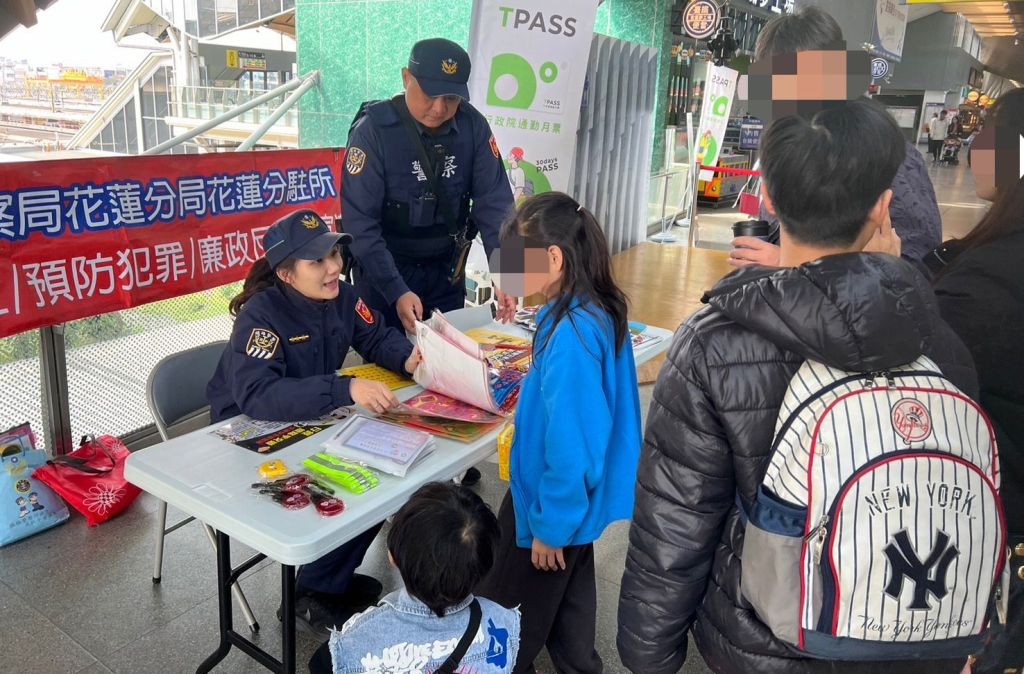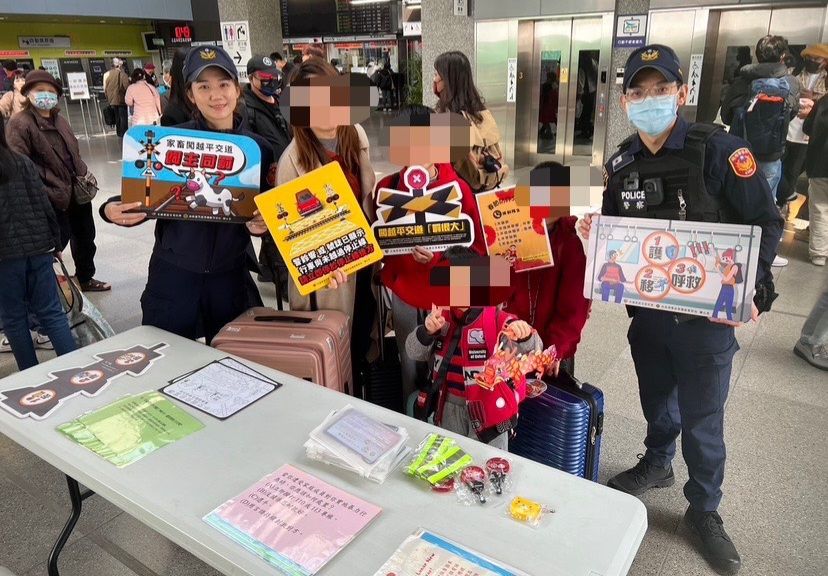 大年初二,鐵路警察局花蓮分局花蓮分駐所交安宣導不停歇,副所長樂群帶領警員許愛庭、曾家威在花蓮車站設攤,對旅客進行平交道交通安全宣導及反詐騙小知識。