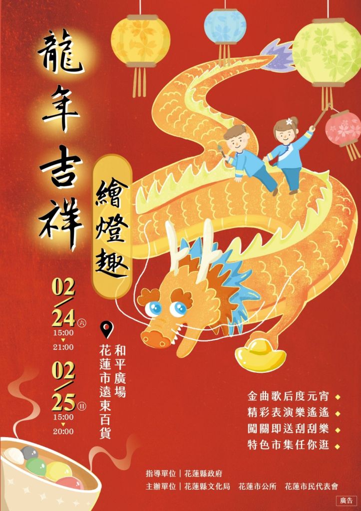 每年的農曆正月二十是客家傳統節慶「天穿日」,花蓮市公所2月24日起在遠東百貨花蓮店前廣場辦理龍年吉祥繪燈趣活動,參與猜燈謎闖關即贈刮刮樂,一連兩天也分別舉行特色主題蔬食市集,還有客家歌手徐世慧等現場表演。活動即日起先行提供民眾索取五行燈籠進行彩繪,經活動票選最高可獲得價值一千元禮券,市長魏嘉彥歡迎民眾共下來尞。