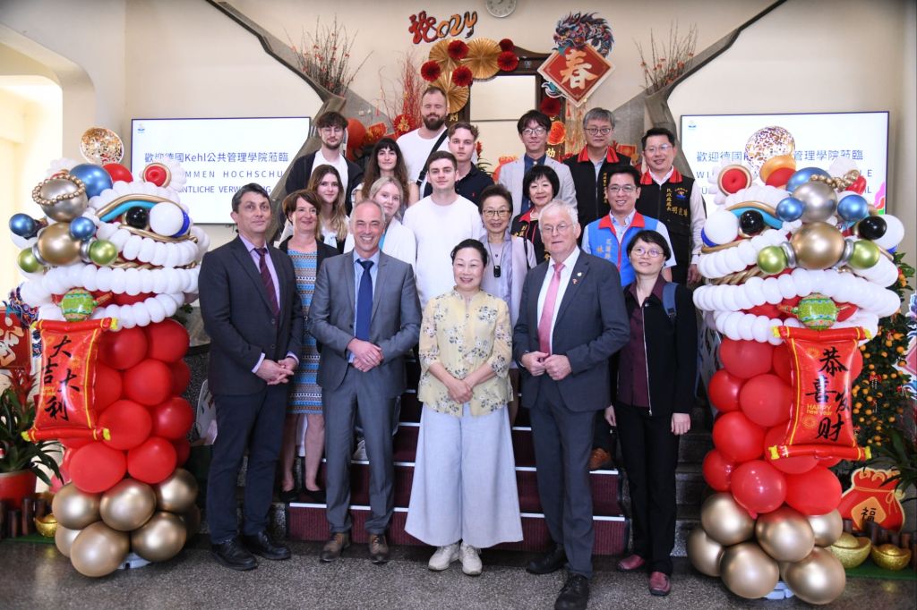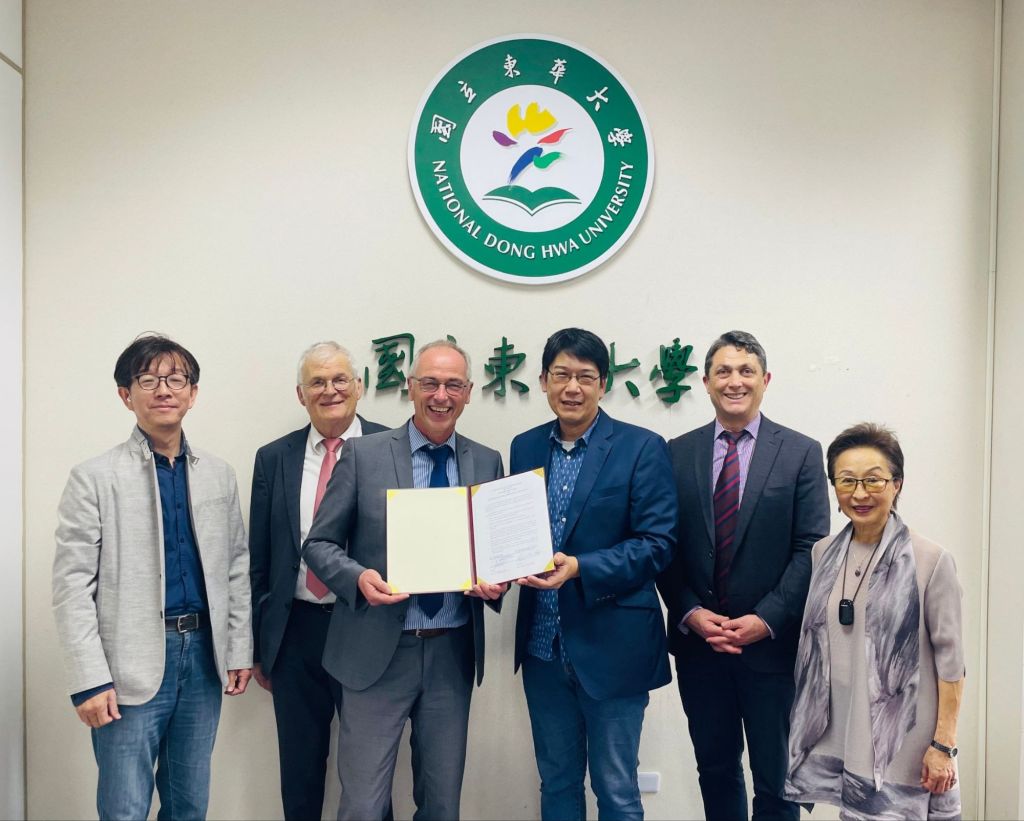 德國參訪團下午三時前往國立東華大學參訪校園,東華大學國際處長副處長侯介澤接待,雙方完成MOU簽署後合影,並由縣政顧問韓宜靜、東華公共事務研究學會榮譽理事長田俊雄、縣府國際事務中心主任楊順宇等人共同見證。