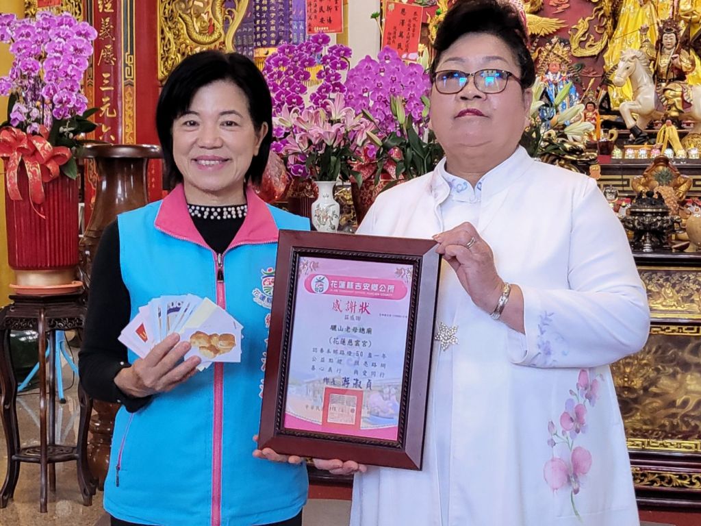 花蓮縣吉安鄉驪山老母總廟慈雲宮不僅長年捐贈愛心物資、個案救濟金給鄉公所捐助平台,更將點光明燈祈求平安的習俗移轉為認養光明路燈,以另一種方式來詮釋主祀驪山老母佈德善行共同守護鄉親安全。鄉長游淑貞於日前特地前往總廟致贈感謝狀並轉贈麥當勞餐單品分享券,感謝慈雲宮師姐葉美玉拋磚引玉認養50盞平安路燈,其善行義舉令人感佩,鄉公所將克盡職責落實各項優化社區環境,完善鄉親眾生出入安全。