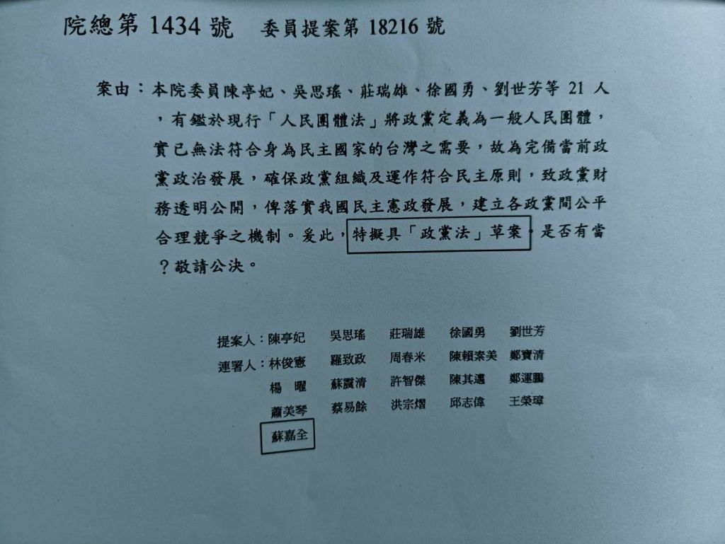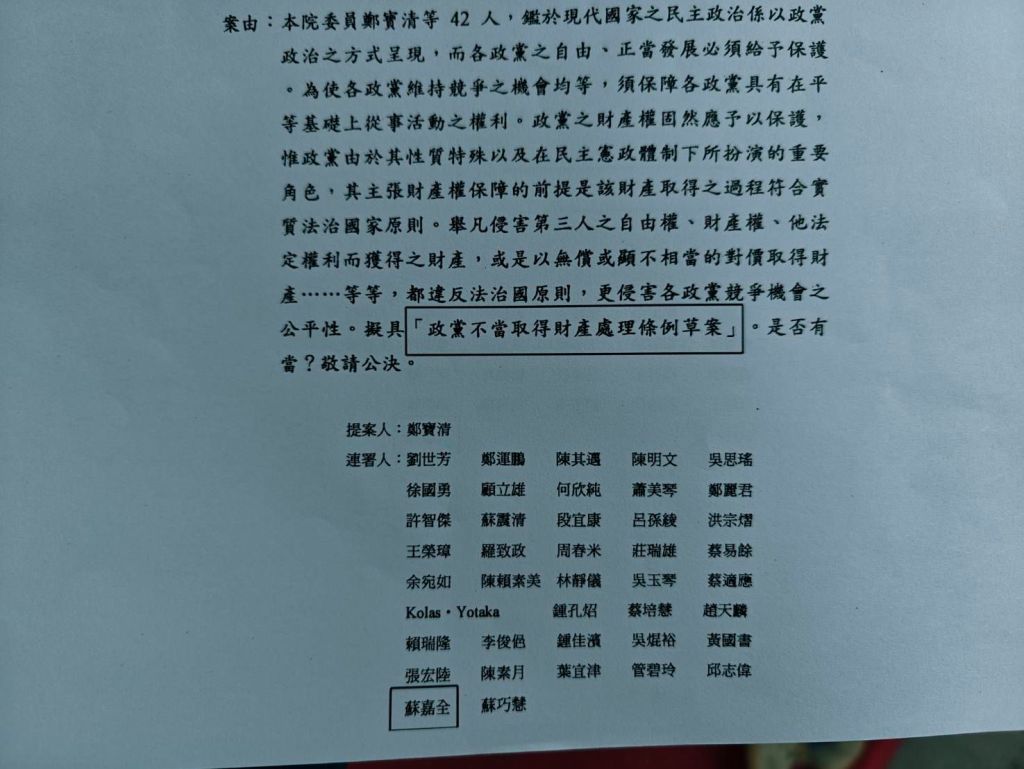 傅崐萁指出,民進黨似乎是在立法院派了一位「黨籍大法官」,不斷地扭曲在野黨的提案、不斷地在攻擊福國利民的法案,無非就是「綠能,你不能」,柯建銘總召只會使用蠱惑民眾、造謠抹黑的老招數。柯建銘稱院長不得提案、不得連署要議事中立,但蘇嘉全擔任立法院長期間曾經作為連署人,簽署高度政治性的《政黨法》及把國民黨抄家滅門的《黨產條例》。