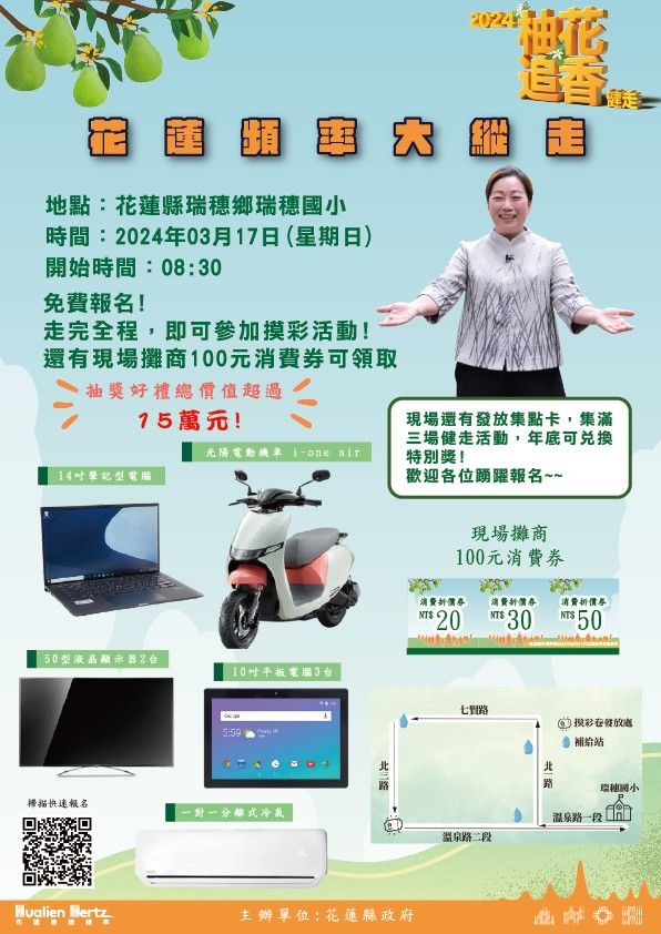 花蓮縣政府於3月17日(日)上午8時在瑞穗鄉瑞穗國民小學舉辦「2024花蓮頻率大縱走 柚花追香健走活動-瑞穗場」,活動精彩熱鬧,活動時間內走完全程者,均可參與摸彩,摸彩品豐富,有電動機車、筆記型電腦、平板電腦、一對一分離式冷氣及液晶顯示器等大獎,此外,走完全程還有驚喜獎及現場攤商消費券100元,縣長徐榛蔚邀請全縣鄉親及遊客前往共襄盛舉,運動健身,拿好康。