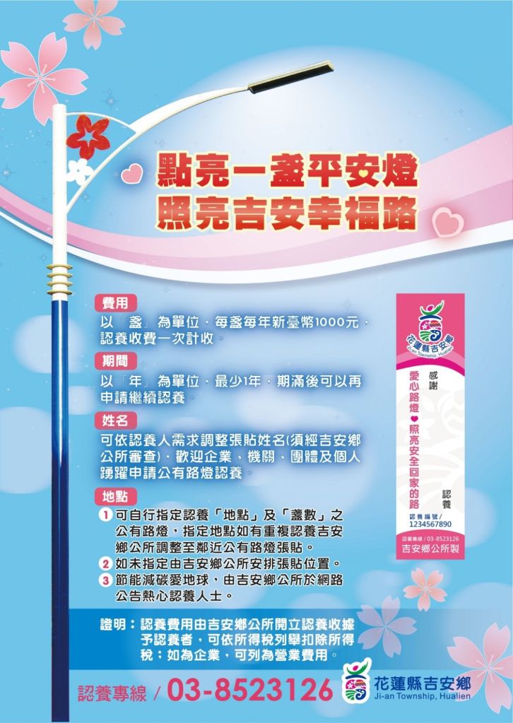 鄉長游淑貞表示,自上任以來,很感謝吉安農會108年、111年皆認養百盞平安路燈,此次再度響應點亮百盞路燈,以及鄉內許多宮廟、企業、公司行號或鄉親個人加入點燈行列,無關金額多寡,每一盞愛心路燈照亮人間祥和大愛!希望每個夜歸鄉親或遊客都能感受這份溫暖量能,安心生活在山海環繞的幸福鄉城。
