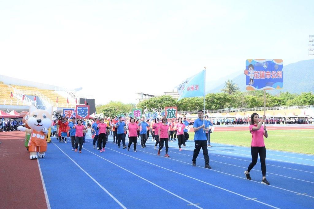 花蓮市公所團隊創意進場,首先揮舞著我國國旗以及與花蓮市建立友好城市關係的各國旗幟,象徵要將環保淨零觀念與國際接軌,緊接著映入眼簾的還有來自太平洋縱谷馬拉松的吉祥物斑馬、羚羊、柴犬與山豬,邁著大步與全場互動打招呼。