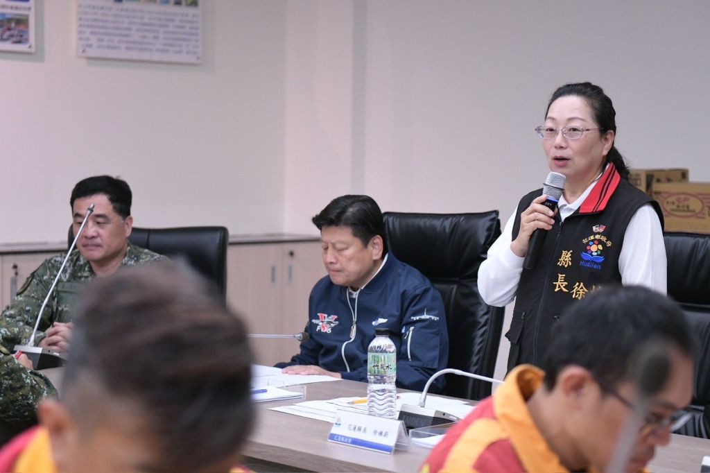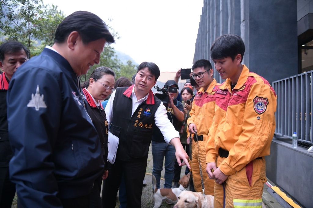 徐縣長再次感謝國軍弟兄以及各縣市政府於第一時間派員協助花蓮縣消防局進行各項救災工作,搜救人員們帶著搜救犬及救難器材,徒步挺進災區,持續搜尋與救援仍失聯的人員,把握黃金救援時間,不放棄任何希望,我們共同集氣期盼儘快尋獲失蹤人員,大家都能平安脫困返家。
