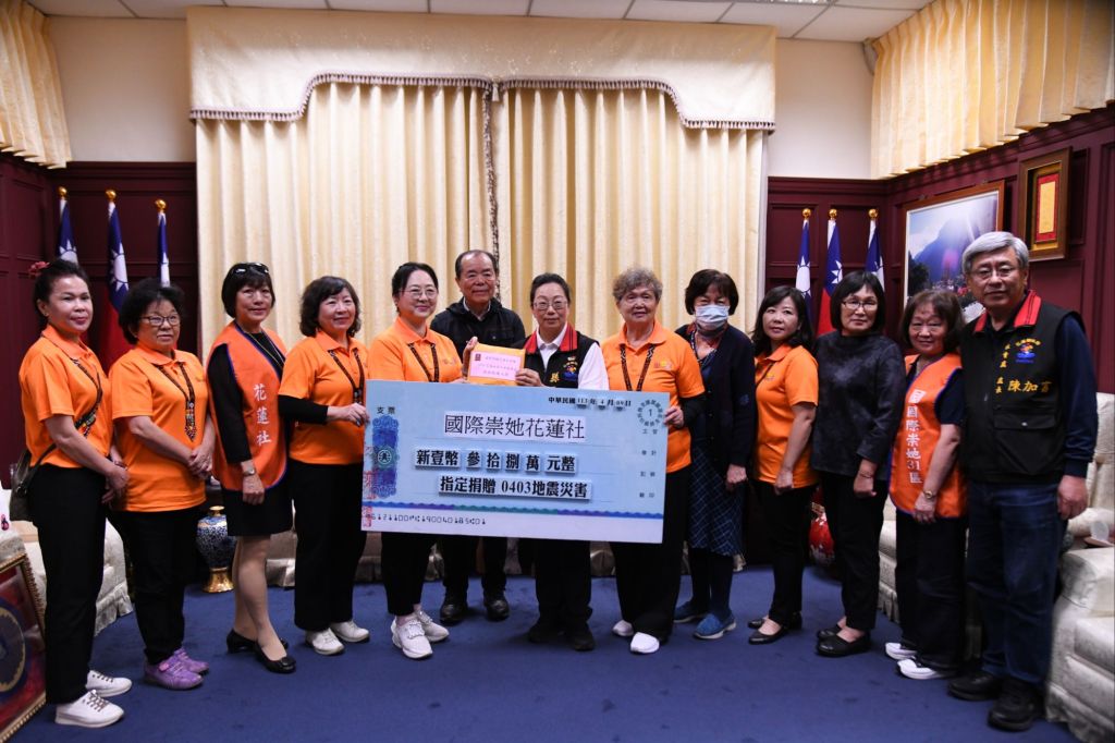 0403強震災後邁入第八天,各界善心不斷湧入,國際崇她花蓮社邱秀華社長一行10人今(9)日下午拜會花蓮縣政府,集結社員之善心,合力捐贈38萬元,並在日本知名防災專家山村武彥教授見證下捐贈,由徐縣長代表接受,徐縣長感謝國際崇她花蓮社陪伴受災戶,走過災後重建之路。