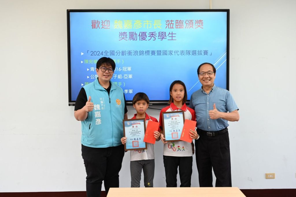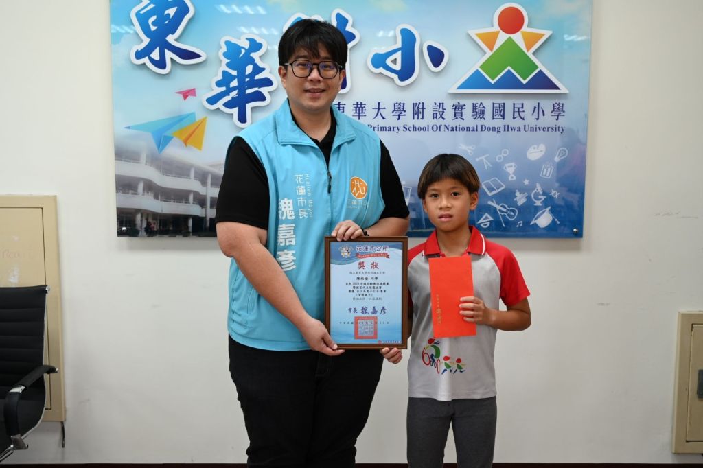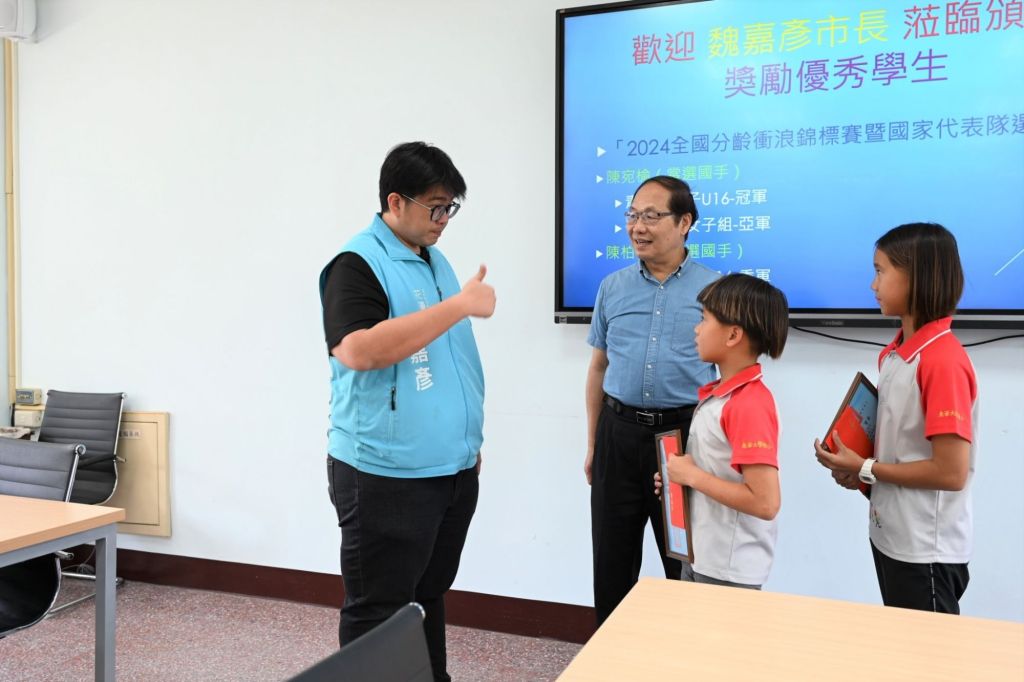 市長魏嘉彥11日特地前往東華附小,頒贈獎狀及餐券,表揚兩位選手在全國賽事上的傑出表現,他表示,衝浪是一項極限運動,衝浪者需要在適宜海浪的地方俯臥或坐在衝浪板上等待,抓準合適的海浪來襲時間,不畏懼的在衝浪板上站起、保持平衡,這對年僅10幾歲的孩子來說,需要相當大的勇氣,對於兩位選手有如此良好的成績,感到非常佩服。