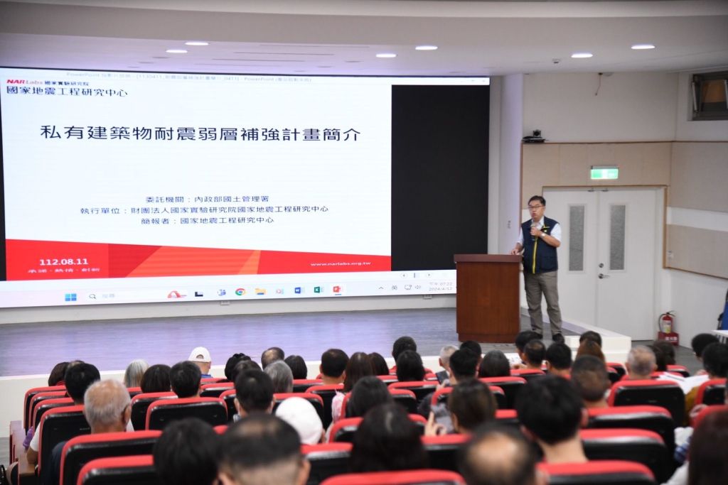 花蓮縣政府今(12)日晚間召開災後建築物弱層補強計畫說明會,邀集蓮花藝術廣場公寓大廈住戶到場,由台灣省土木技師公會江文卿協助住戶了解私有建築物耐震弱層補強的補助流程,縣府也特別於會中說明災後相關慰問金與補貼辦法。