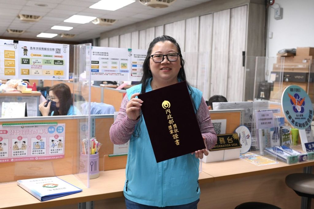 這次代表市公所前往受獎,同時也是役政有功人員的林玉珊表示,兵役業務其實相當繁雜,有時會面對不願意配合服役的民眾,甚至遇過不願回國當兵的人民,但在秉持役政公平的原則上,必須花時間輔導追蹤他們的去向,並將名單交由地檢署,請民眾到案說明,她也藉此呼籲,服役是中華民國男子的責任與義務,請大家配合國家政策,以免因妨害兵役而讓後續處置更加繁雜。她感謝縣政府的推薦,因而得到國防部及內政部授予的殊榮,往後會在業務上更加用心努力。