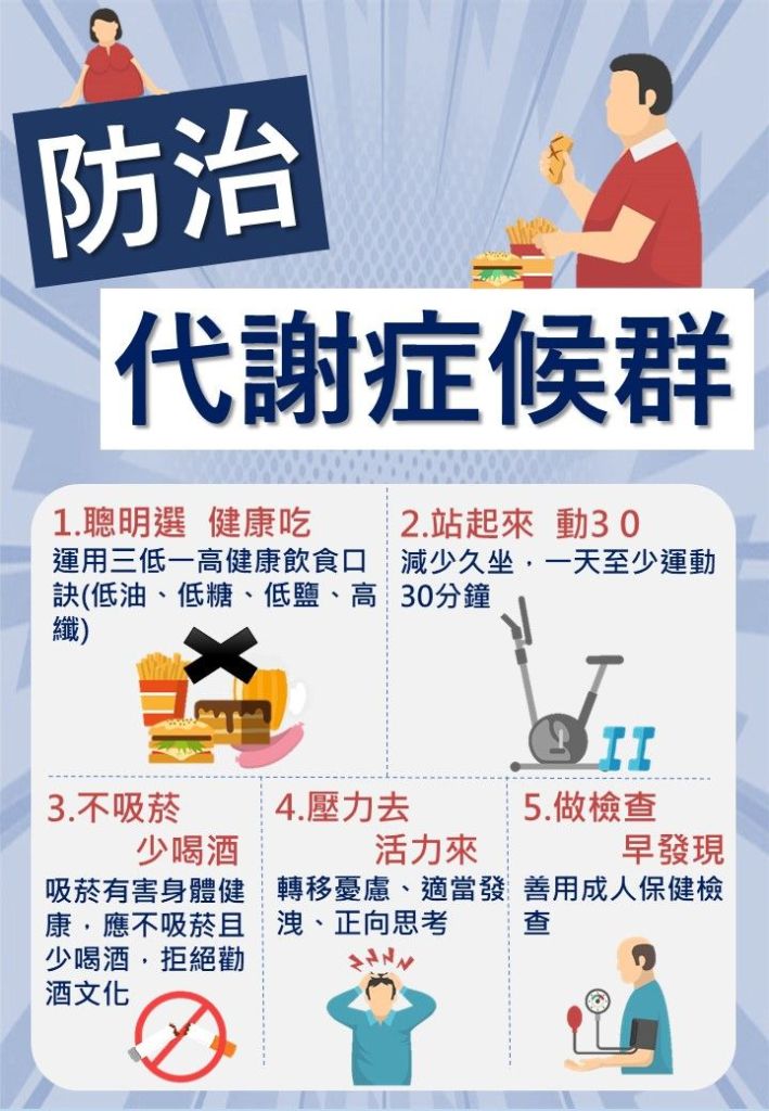 - 做檢查,早發現:國民健康署免費提供健檢,40歲以上未滿65 歲,每3年1次,滿65歲每年1次。內容有代謝症候群篩檢,包括血壓、腰圍測量、血糖、三酸甘油酯與高密度脂蛋白膽固醇抽血檢查,健康行為與憂鬱檢測。