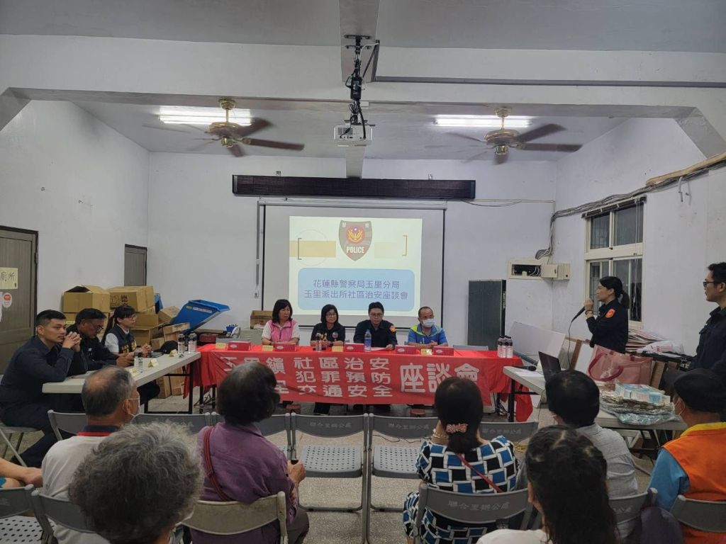 警察維護社區治安、交通常有賴民眾熱情參與,藉由溝通加油分享,順勢搭起警民間的合作橋梁。昨(15)日晚間19時,花蓮縣警察局玉里分局玉里派出所,為傾聽居民意見,假玉里鎮聯合里辦公室舉辦社區治安座談會。此次由啟模里長陳文祥主持,會中邀請警察志工中隊長鍾素政、國武里長陳玉蘭、中城里長姜學文、啟模里社區發展協會謝光南理事長及村民約50餘人列席參與;玉里分局第一組組長陳博宜、第三組組長林國銘、第四組組長陳暐傑、偵查隊副隊長姚采璇到場與民眾面對面互動,針對問題提出具體解決方案。