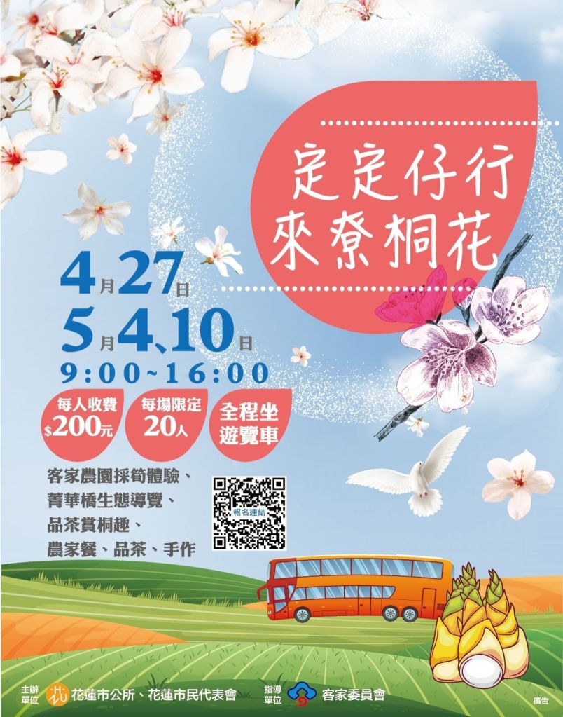「定定仔行-來寮桐花」小旅行,共分為4月27日、5月4日、10日三梯次,每梯次報名人數限額20人,報名費用每人次200元(含午餐)。欲報名者請填寫表單 https://forms.gle/gVUbJPPAWpEiTfUk8 ,或洽花蓮市好客文化會館臉書粉絲專頁。