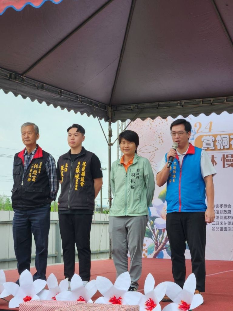 客家委員會委員葉仁基、立法委員傅崐萁服務處主任陳威誠、花蓮縣議會議員林則葹、林品仰、議長服務處主任張宸瑋、林源富服務處主任林進順、花蓮縣政府客家事務處處長潘乾鑑、花蓮縣政府中區服務中心副主任林榮祿、鳳林鎮前鎮長蕭文龍、鳳林鎮民代表會主席龍春文、代表吳徐素美、劉喜湘、黃靜珠、鳳林鎮鳳仁里里長陳彥傑、鳳智里里長黃靜宜、鳳信里里長張振華、大榮里里長莊秀英、南平里里長陳文乾、北林里里長黃正輝、鳳林國小校長李國清、北林國小校長朱天德、林榮國小校長許傳方、鳳榮地區農會理事長徐芳鑑、總幹事黃榮和、鳳仁社區發展協會暨鳳林生活美學協會理事長吳穎甄、中興社區發展協會理事長徐玉枝、花蓮縣客屬會常務理事邱紫惠、壽豐分會會長劉鎮興、鳳林鎮客屬會會長梁添登、前會長黃信龍、鳳林鎮保健志工協會理事長蘇月琴、鳳凰土風舞研究社理事長田桂英、花蓮縣牛根草社區發展促進會理事長陳美珍、鳳林鎮體育會理事長楊志偉、中區公教協會理事長鄧明星等貴賓共賞桐花。