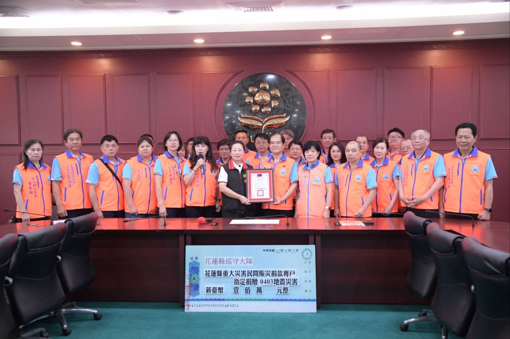 花蓮縣巡守大隊之大隊長詹維明帶領一行26人前來捐助新台幣86萬餘元,詹大隊長表示,這筆善款金額與眾多企業慷慨解囊相比之下確實不多,然而卻是所有巡守夥伴們一點一滴所累積起來的善心,徐縣長也深知巡守夥伴們都是挪用生活開銷合力集資捐助災民,徐縣長深深受到巡守夥伴的善心感召,因此表態添薪火與花蓮縣巡守大隊合力捐助新台幣100萬元。