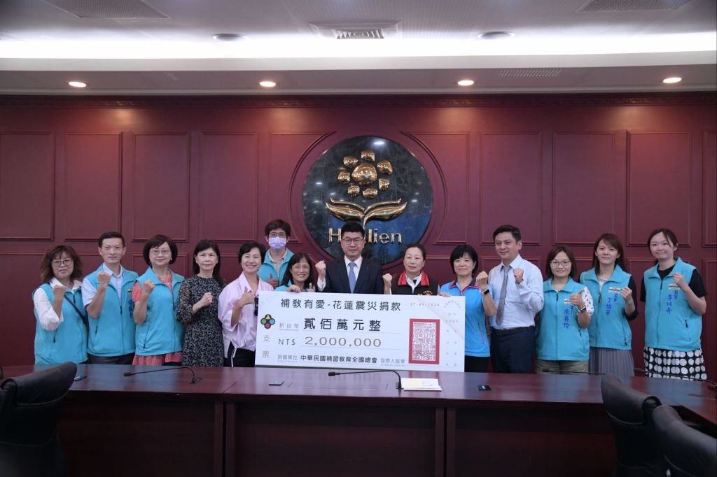 另外,中華民國補習教育全國總會在總會長楊佳叡帶領下,也前來捐助新台幣200萬元,吉安鄉長游淑貞亦到場見證,楊總會長表示,捐助款項並非鉅額,卻是匯集全國各地的愛心,期盼這股力量能帶給花蓮災民生活新希望,更冀望能成為延續全國各界善心的火種,帶動更多國人及社會團體加入扶助災民與救助災區實際行動的行列。