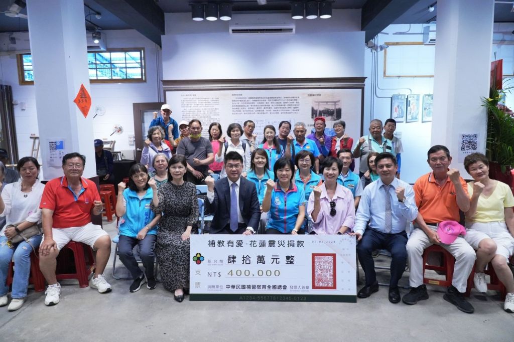補教有愛不落人後!中華民國補習教育全國總會楊佳叡總會長,及來自全國各地幹部一行人,在花蓮縣補教協會張千惠理事長陪同下,特到吉安鄉捐贈善款40萬元,鄉長游淑貞親接待這群補教界友人,並導覽好客藝術村設施與展演活動;游淑貞感謝社會各界匯聚善緣,對花蓮和吉安的關懷,她與公所團隊定秉持服務初衷,續為重建工作奮鬥不懈。