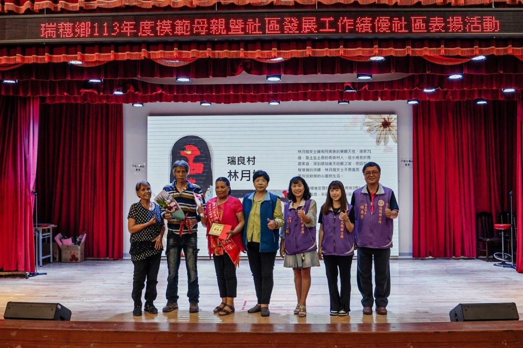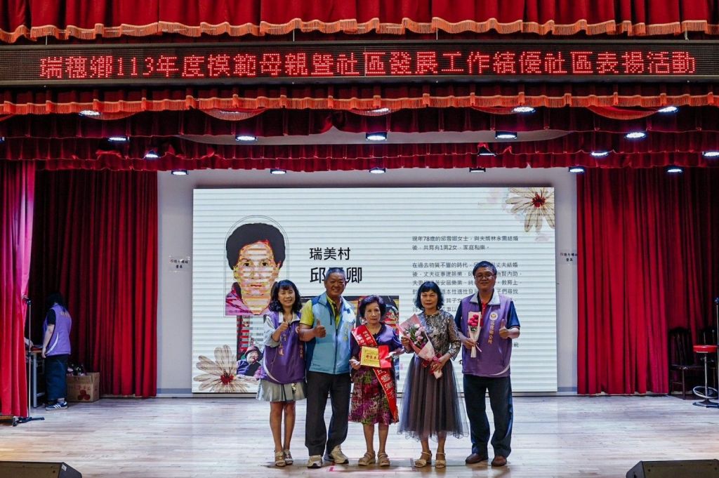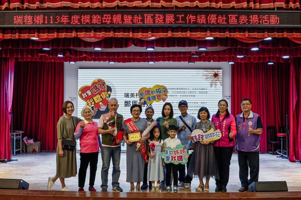 5月10日母親節前夕,花蓮縣瑞穗鄉公所舉辦了一場感動人心的模範母親暨績優社區表揚活動。瑞穗的鄉親們在鄉公所四樓演藝廳齊聚一堂,向11個村共13位的模範母親表達敬意與感謝。蒞臨貴賓有傅崐萁立法委員服務處主任張沛瑩、花蓮縣政府南區服務中心副主任周玉梅及王麗秋、瑞穗鄉民代表會主席羅文騰、副主席陳源發及各鄉民代表、各村村長、瑞穗鄉各社區理事長、瑞穗鄉戶政事務所主任江坤霖、瑞穗鄉老人會理事長林永峰、瑞穗鄉調解委員會主席莊文貴、舞鶴國小校長連吳卿等人到場共襄盛舉。