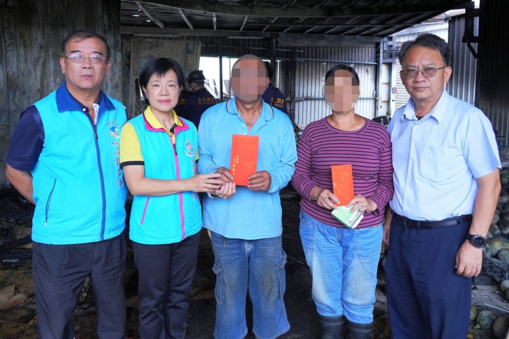 姚姓屋主看到游淑貞親到場關懷,即表達感謝鄉公所社會課長周澤生與相關人員當下即到場協助,尤其是游鄉長百忙中特偕同張總幹事一起來前來解決後續機具補助協助份外感動,他說起,倉庫是鐵皮平房,裡面堆放了農機具和剛採摘下的南瓜等蔬果,還有一整年供需的包裝類紙箱等,雖然消防人員很快就控製火勢,但已經將全國宅配所需的栗子南瓜燒毀殆盡,平日犁田的機具也都毀於祝融無法再用。