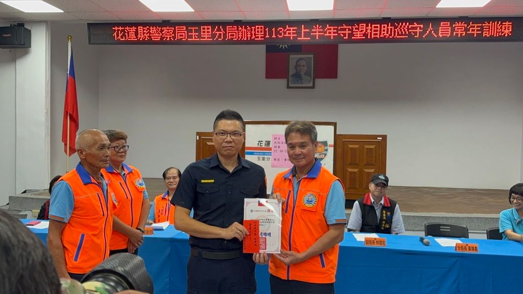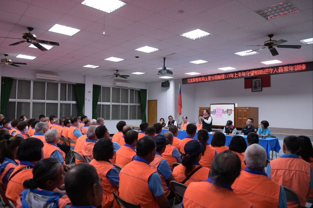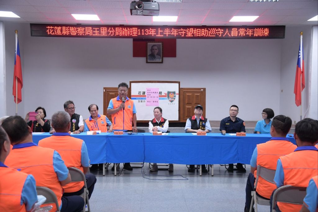 113年上半年度守望相助人員常年訓練,昨17日晚間在玉里分局舉行,參加訓練人員高達113人。此次出席貴賓有縣長徐榛蔚(民防總隊長)、巡守大隊大隊長詹維明、副大隊長詹金富、玉里巡守中隊長邱玉林、副中隊長陳勝駿、縣議員鍾素政、金淑敏、縣政府南區服務中心副主任陳志源等貴賓蒞臨;警察局部分由副局長林建佑、保安科長吳國經、分局長黃靖堯率業務組同仁與會。