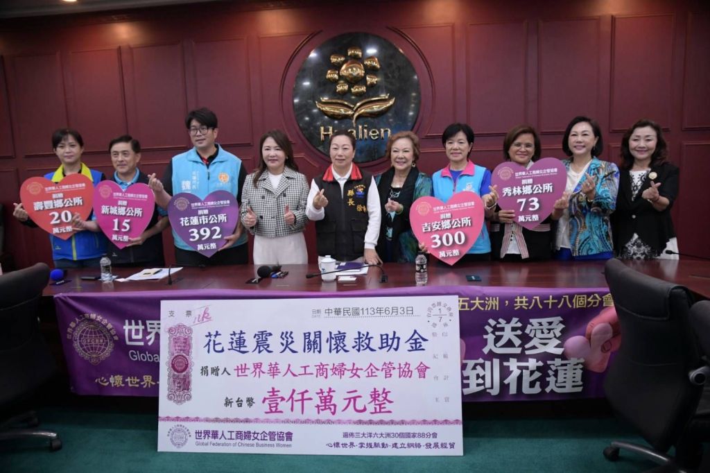 0403地震衝擊花蓮北區經濟,世界華人工商婦女企管協會總會發起賑災募款,募款總計新台幣1000萬元,分別捐贈給縣府及受災鄉鎮之公所,以便發放給受災戶,希望讓受災鄉親度過重建難關。