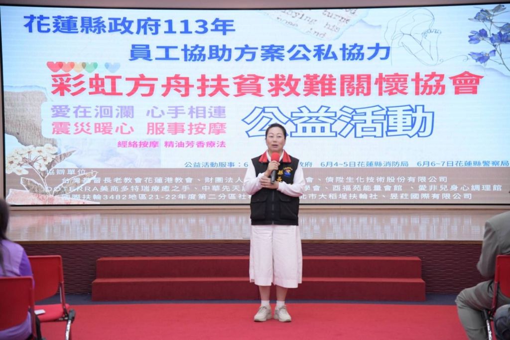花蓮縣政府與彩虹方舟扶貧救難關懷協會今(3)日在縣府大禮堂攜手舉辦送暖按摩活動。縣長徐榛蔚出席支持,此次活動由縣府人事處規劃,彩虹方舟扶貧救難關懷協會等10個協力單位鼎力支持,共同帶領20名來自各縣市關懷協會按摩志工參與服務,展現社會各界投入花蓮災區暖心的行動善舉,志工們藉由按摩及精油芳香療法,有助縣府同仁身心解勞,在職場上更能發揮工作效率為民服務。