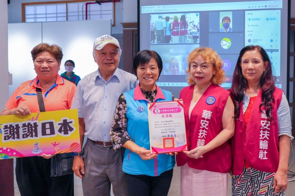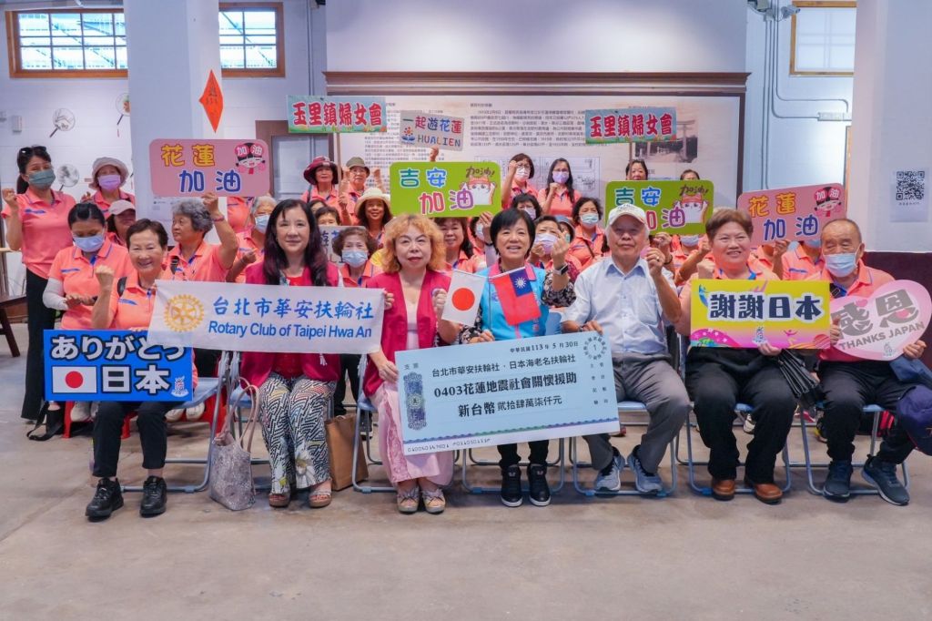台北華安扶輪社長謝隆光與財務長林淑梅滿懷愛心、無懼餘震前來花蓮縣吉安鄉關懷災情,帶著日本友社海老名扶輪社善款日幣40萬元、以及華安扶輪社員愛心捐款台幣16.6萬元,合計新台幣24.7萬元予仁愛基金專戶;捐贈典禮透過現場和跨海視訊進行,藉由客委會葉仁基委員協助翻譯順暢溝通,鄉長游淑貞親向遠在日本的海老名扶輪社長葛野耕司(KUZUNO KOJI)表達感謝,現場還有來自玉里鎮情義相挺振興產業旅遊的40餘位婦女姊妹鄉親,共同見證參與這份千里遙送可貴的祝福。