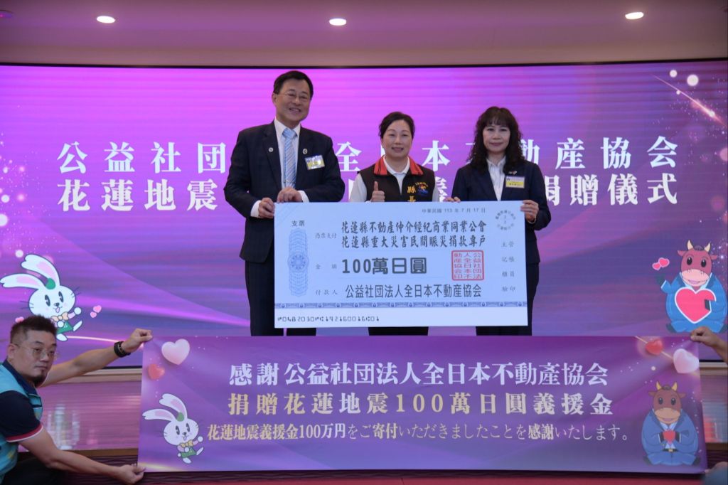 會中由房仲全聯會理事長王瑞祺代表公益社團法人全日本不動產協會,將義援金100萬日圓支票交予花蓮縣公會理事長韓林梅,花蓮縣長徐榛蔚亦代表花蓮鄉親,將伴手禮贈予房仲全聯會王理事長及全體理監事,感謝房仲全聯會的善心義舉,以實際行動挺花蓮,為震後經濟復甦提供重要支持。