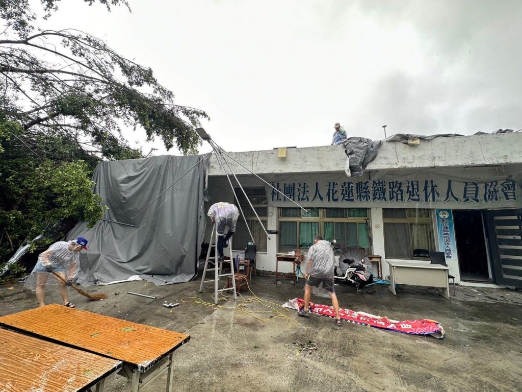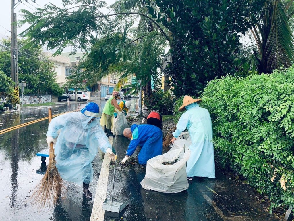 凱米颱風侵襲花蓮,不僅許多路段行道樹枝斷裂、樹葉被吹落,連市區及道路都出現招牌、帆布及店家裝置掉落等情事發生,隨著颱風逐漸遠離,各地環保志工隊除了在颱風來襲前加強巡視社區溝渠與排水設施確保排水順暢外,在風雨漸歇的第一時間,也自主奔赴社區中受災地點,展開清理工作。環保志工們穿著雨衣帶著工具,堅定地走在每一條被颱風肆虐過的街道上,清理樹木斷枝與垃圾。