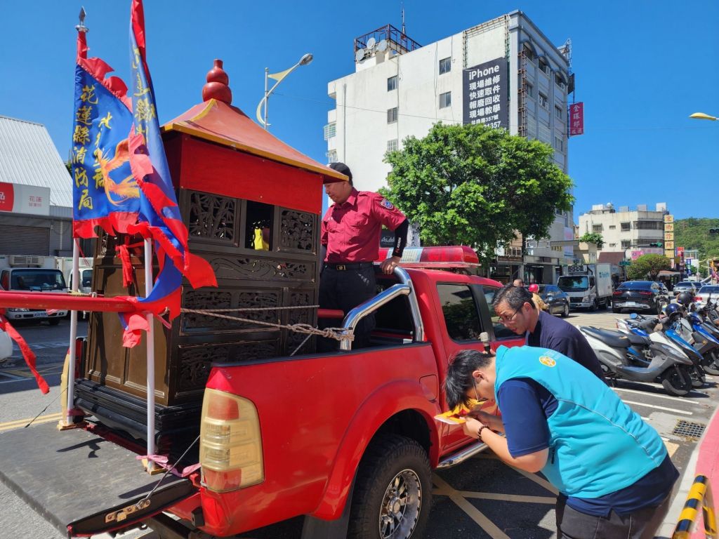 火德星君繞境車隊28日下午特別駐駕花蓮市公所,市長魏嘉彥、主任秘書翁美華、市民代表會主席李振瑋和公所同仁一齊持香敬拜,為花蓮市祈福。