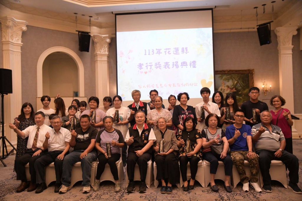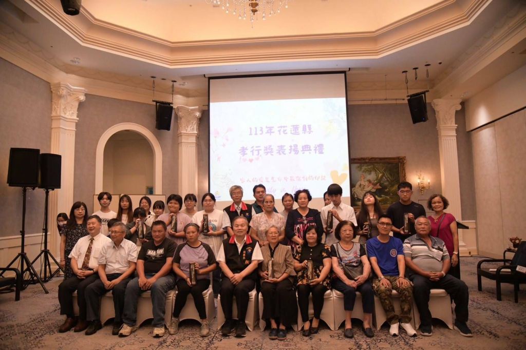 為彰顯孝行價值,推廣孝道精神,藉由楷模事蹟創造社會溫暖和諧,花蓮縣政府今(30)日於遠雄悅來大飯店舉行「113年度孝行獎表揚典禮」。副縣長顏新章頒獎表揚十位孝行楷模,期許藉由孝行楷模表揚,鼓勵鄉親共同建立孝道倫理,讓社會充滿正面、良善與安定的力量。
