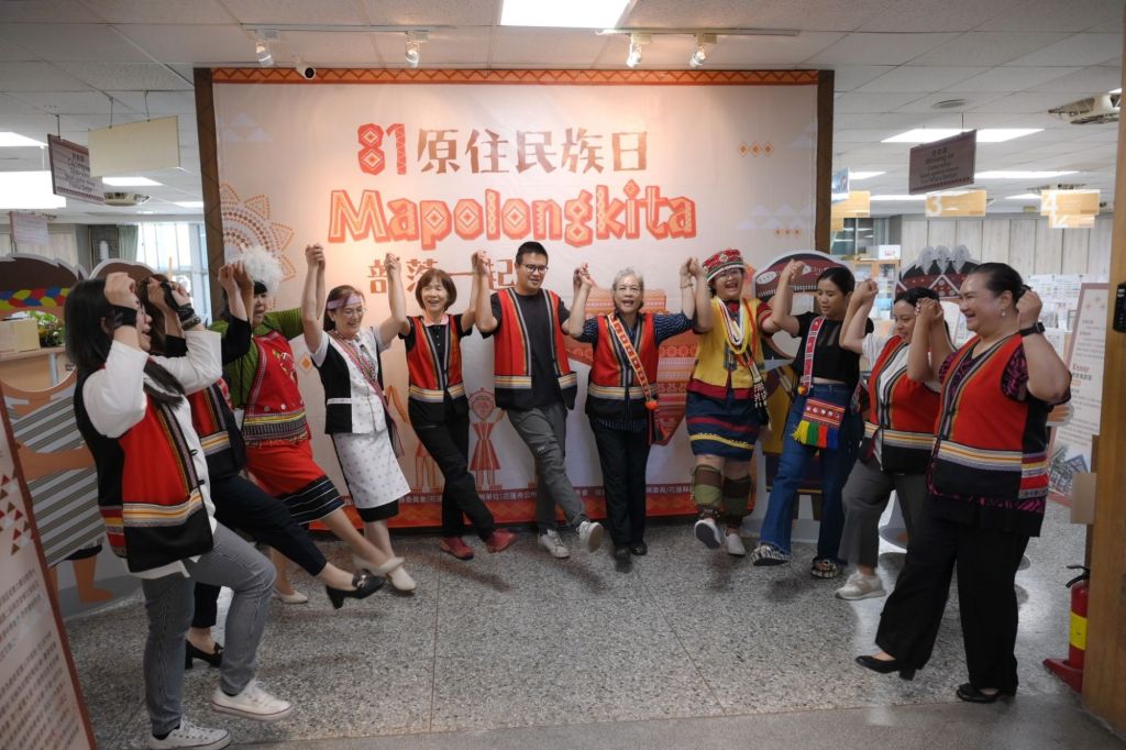 市公所原行課同仁身穿族服與背心,手牽手唱起歌謠。為了歡慶原住民族日,大家展現原民的精神,熱情的邀請前來洽公的民眾一同加入互動行列,現場不僅有打卡看板,還有族語闖關活動,完成關卡還可以得到原住民族日限定馬克杯,或是原民風手工小包,參與人數相當踴躍。