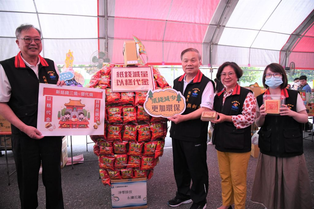 焚香燒紙一直是民間傳統祭祀儀式,中元普渡是民間信仰中的重要節期,花蓮縣環境保護局也於普渡法會上積極宣導「紙錢減量 以糕代金」政策,期望達到紙錢零焚燒,朝淨零碳排目標邁進。