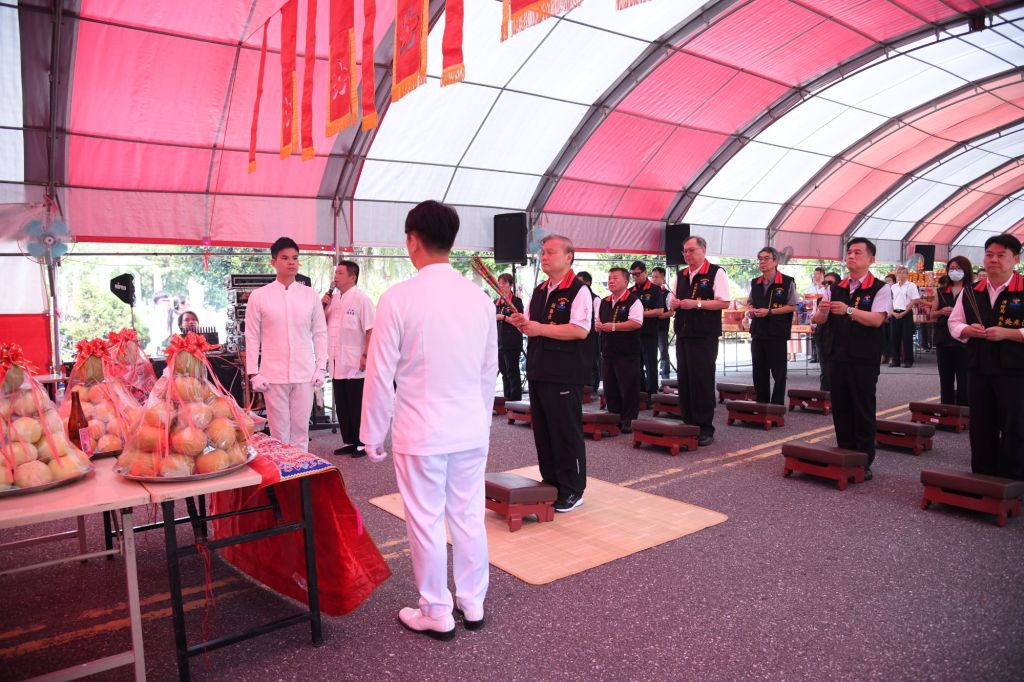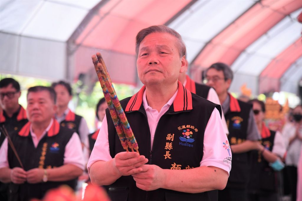 顏副縣長率領縣府全體同仁於法會上香祝禱,依循古禮虔誠敬拜,並以三跪十二叩首最敬禮,向皇天后土、天公地母、四方眾神虔誠祈福,祈求諸神持續護祐花蓮縣境平安、物阜民豐、百業興旺、五穀豐登,場面莊嚴隆重。