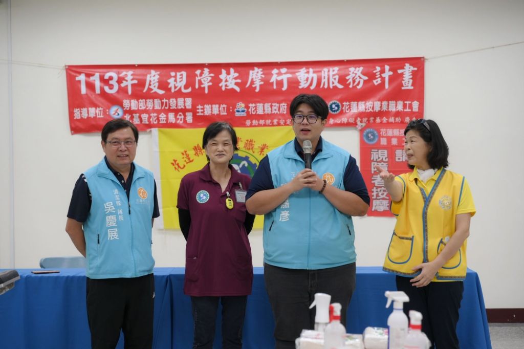 十名視障按摩師各就各位,為每位隊員提供按摩服務,經過大家的巧手,每個人從頭部、肩頸到背部肌肉,都受到仔細照料。魏嘉彥市長專程到場,向花蓮縣按摩業職業工會及全體視障按摩師表達感謝,並親自體驗按摩。體驗結束後,他也豎起大拇指讚技術精湛。
