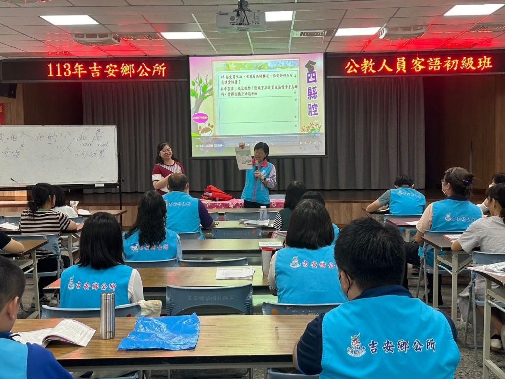 客家所所長謝美惠指出,此次初級認證班由客家委員會與花蓮縣政府共同指導,吉安鄉公所及吉安鄉民代表會主辦,七十餘位學員分別來自吉安鄉公所同仁、稻香社區發展協會成員以及社區民眾,7月至9月(周一及周四)分別在吉安鄉公所親民堂(下午3時至5時)及稻香社區活動中心(下午7時至9時)授課,由客語能力認證中高級合格的鍾蕙伃和吳玉苹薪傳師主課。講師透過影音教學、語言學習APP、分組演練及自主學習等方式教學。講師也會臨場檢核評量學員學習進度,教學方式多元活潑,為大家的基礎客語聽、說、讀、寫增能。連續多年擔任認證加強班的客語薪傳師鍾蕙伃表示,公所同仁在繁忙公務下,能利用瑣碎時間主動學習,認識客家用語及辭彙、不斷重複矯正客語發音,勤學態度令人激賞。