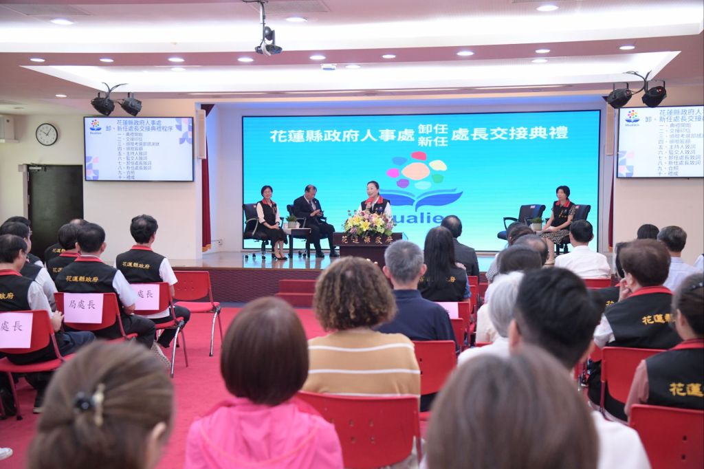 花蓮縣政府今(12)日舉行人事處卸、新任處長交接典禮,由縣長徐榛蔚親自主持,行政院人事行政總處人事長蘇俊榮監交。原人事處處長曾淑芬榮調行政院人事行政總處人事室主任,由副處長吳賢惠接任。徐榛蔚縣長肯定曾淑芬處長任職期間貢獻良多,也期勉新任吳賢惠處長在現有良好基礎上,持續精進人事業務,並為縣府團隊培育人才,達成人才永續目標。