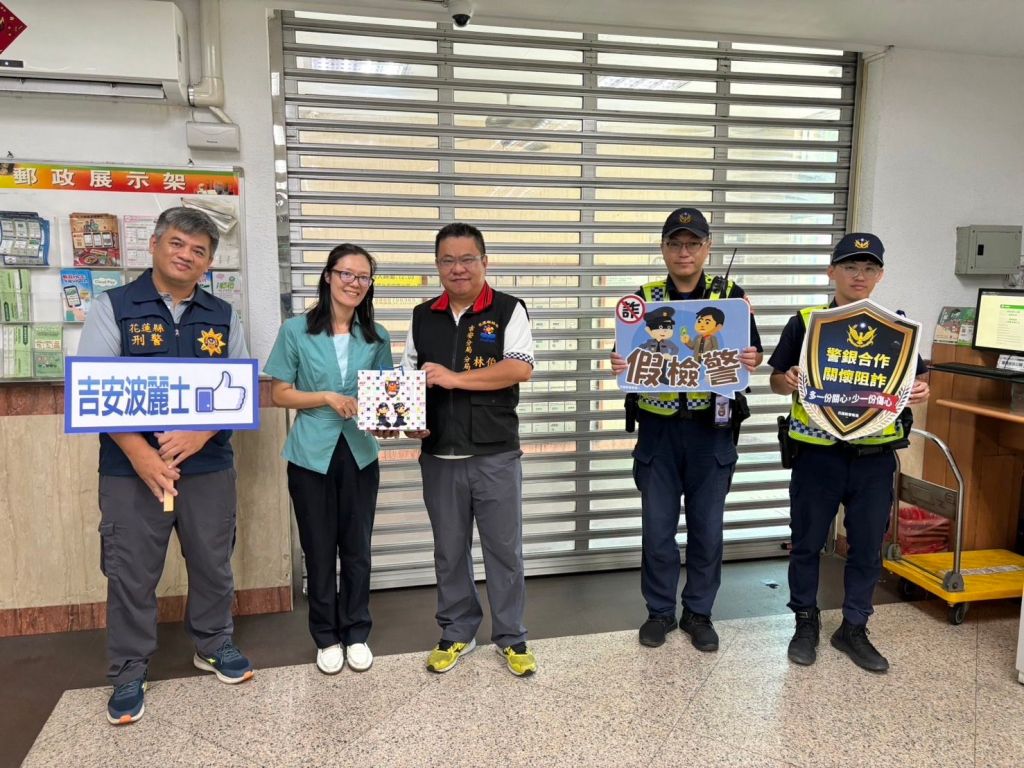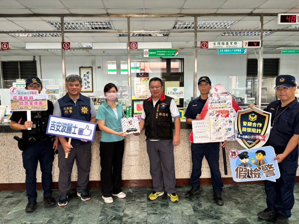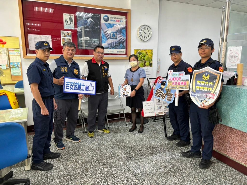 吉安分局長林俊廷於昨11日,率領偵查隊長張淑光、偵查隊及各派出所同仁,製作淺顯易懂宣導圖卡及精美的宣導品,前往吉安分局轄內4家重點金融機構(吉安、太昌、仁里郵局與花蓮一信建國分行)向經理及行員進行宣導,分享臨櫃關懷提問經驗、民眾受騙情境案例及近期的重點工作提示,並與行員建立良好聯絡機制,希冀一同共建阻詐護城河,攜手守護民眾的財產安全。