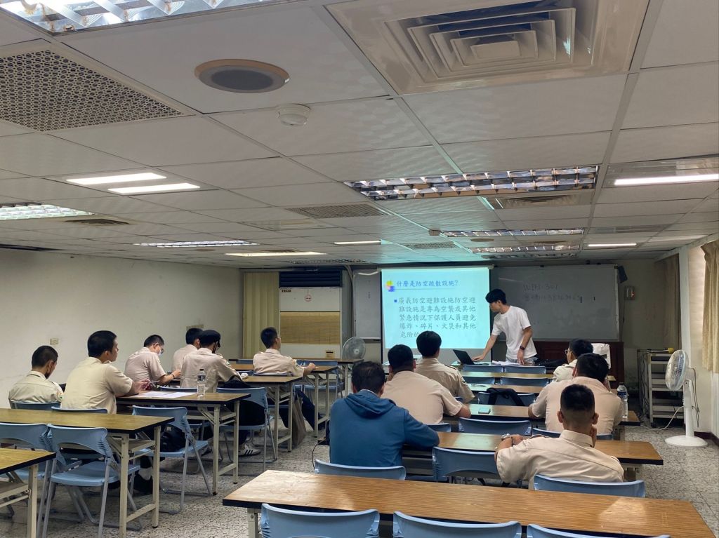 今日次課程包含民防實務綜合課程相關知識及實作演練、基本教練及服裝儀容檢查等課題,特聘請花蓮縣警察局專業講師講授-防災避難訓練如何辨識防空警報、疏散避難處所尋找、「警政服務APP」防空疏散避難專區介紹、及就地掩蔽姿勢演練。
