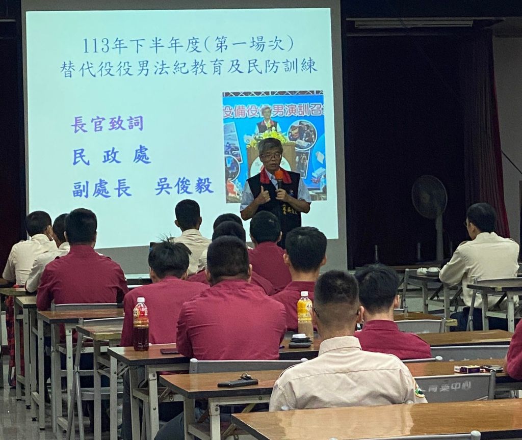 花蓮縣政府今(13)日辦理113年下半年度第一場次替代役役男法紀教育及民防訓練,調訓花蓮縣轄內計9個機關單位26位替代役男參訓,為培養替代役役男民防工作任務,落實民防勤務訓練及知能,以推動現役役男民防訓練,特辦理民防訓練課程。