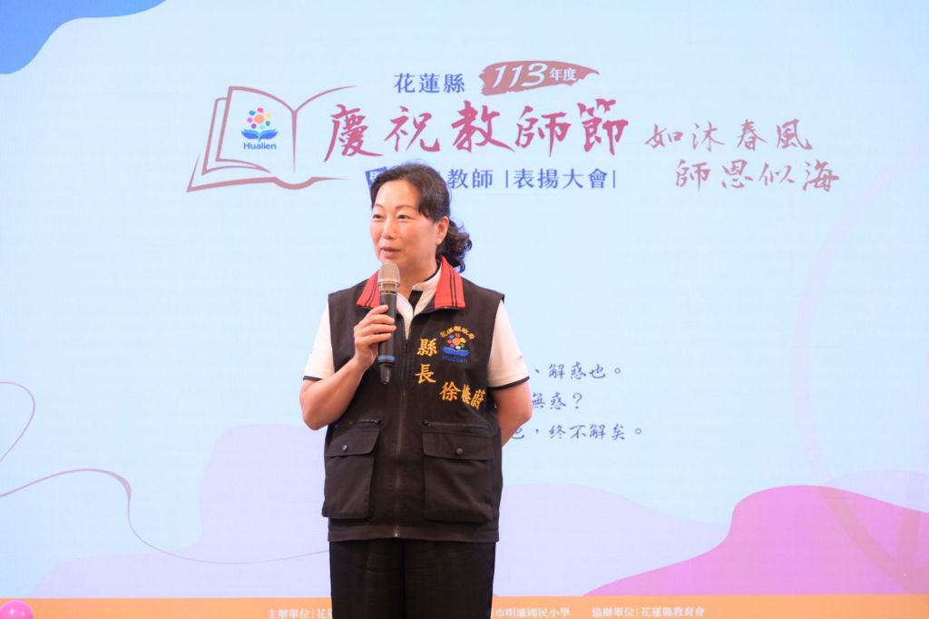 縣長徐榛蔚首先深深一鞠躬,向所有辛勤耕耘在教育第一線的老師們致以最誠摯的敬意和感謝。她以《禮記.禮運》「大道之行也,天下為公。選賢與能,講信修睦。」為例表示,內文雖未有教育的字眼,但皆與教育相關,因為學校教育讓孩子學習長大之後成為台灣有用的人,而教育是人才培育的搖籃,教師是孩子學習的推手,感謝老師們辛苦的付出;即使面對教學型態的轉變,教育的本質仍應回歸以學生為中心,她鼓勵教師們讓孩子們多嘗試新事物,大膽試錯並發揮創造性思維,以不放棄尋求答案的精神,拓展多元開放的學習旅程。