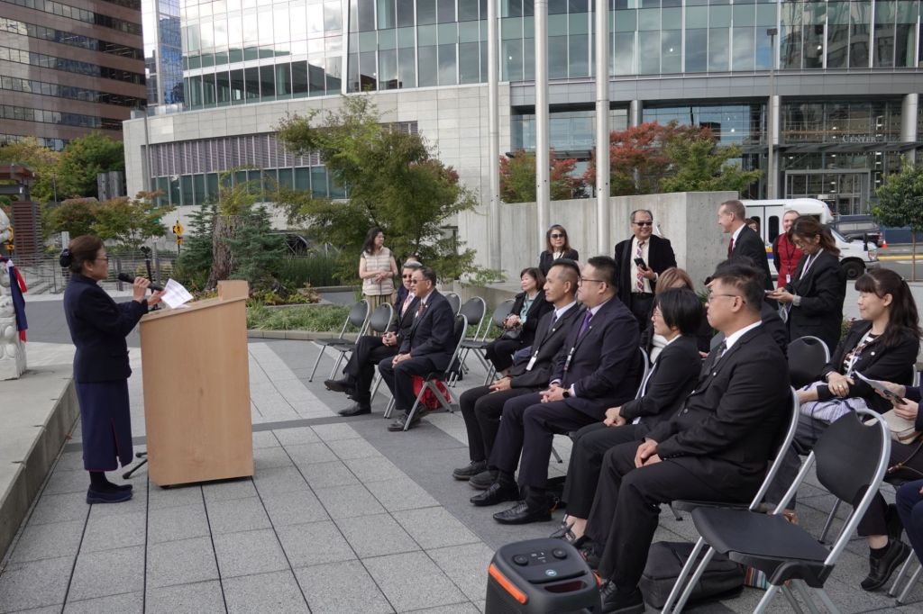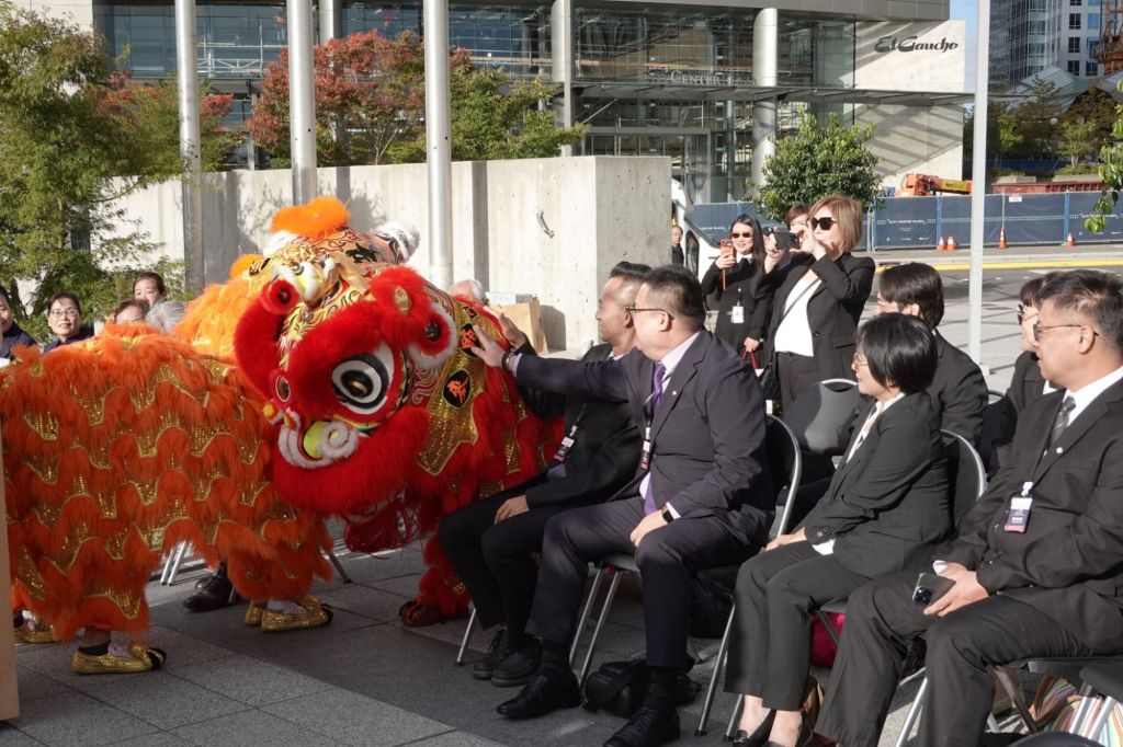 歡迎茶會結束後移師到戶外廣場,姊妹市協會還安排了舞獅表演,非常熱情,同時還有十年前花蓮市致贈的石獅子,象徵兩地情誼堅若磐石,慈濟基金會西雅圖分會的成員也帶來手語歌,歡迎來自家鄉的朋友,場面溫馨又融洽。