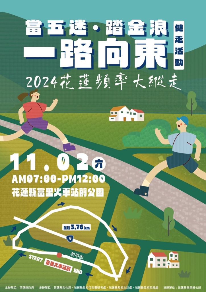 為舒緩天然災害帶來的生活壓力及緊張情緒,花蓮縣政府訂11月2日(六)上午7時至中午12時,於花蓮縣富里火車站站前藝文公園舉行「2024年花蓮頻率大縱走-(11月)-當五迷-踏金浪-一路向東」健走活動。健走活動採開放式自由參加,熱愛運動健身的民眾,期能透過健走帶給花蓮鄉親們健康的好氣色,大手拉小手出發來富里,享受這一切的美好風景。