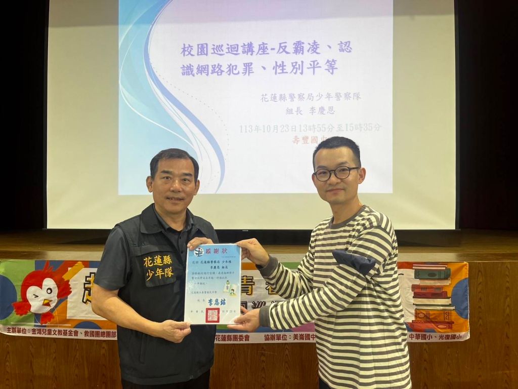 有鑑於近期新興毒品依拖咪酯俗稱「喪屍煙彈」,造成社會多起重大交通事故,除造成民眾財產重大損失,對社會治安更構成嚴重的危害,更甚至危及到執法人員的生命;另隨著社群蓬勃發展、網路快速崛起,雖然帶給我們生活上的便利,但同時也讓「假消息」充斥其中。錯誤訊息總是無所不在,半真半假和混淆視聽,以及徹頭徹尾的謊言和宣傳,加上人工智慧驅動的造假興起,大量增加了不可信的內容,花蓮縣警察局少年警察隊特別於10月22、23日分別前往花商夜校及壽豐國中與校方共同強化校園反毒、網路安全宣導。