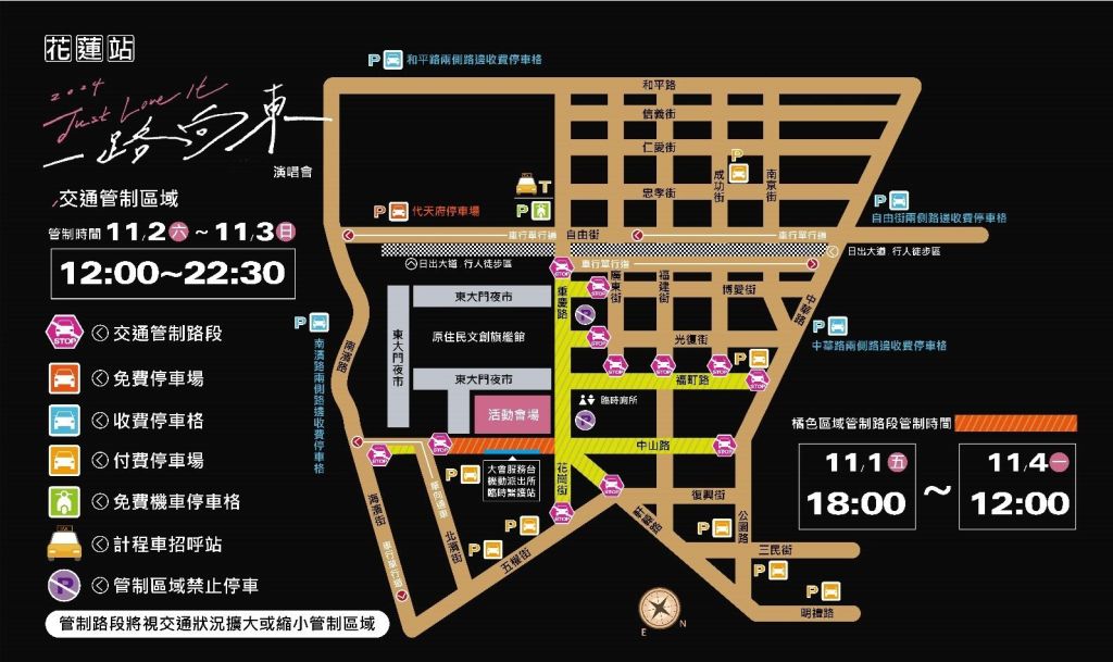 花蓮站的演唱會則於11月2日和11月3日連續兩天在東大門廣場登場,交通管制時間為每日中午12點至晚間10點30分,同樣採兩階段管制。第一階段主要限制花蓮市中山路(中華路至海濱街)、重慶路(中山路至自由街)、軒轅路(復興街至中山路)、福町路(中華路至重慶路)、花崗街(五權街至中山路)、博愛街(廣東街至重慶路)、光復街(廣東街至重慶路)等主要幹道,並在退場時視情況進行第二階段管制,擴張管制地點包含第一區由博愛街、光復街、自由街延伸至中華路,第二區由重慶路延伸至和平路,第三區由軒轅路、花崗街延伸至樹人街,以及第四區福建街與復興街口,以避免人潮車流擁擠,保障活動安全。縣府提醒演唱會周邊的居民和駕駛提早規劃行程,避開交通管制區域。