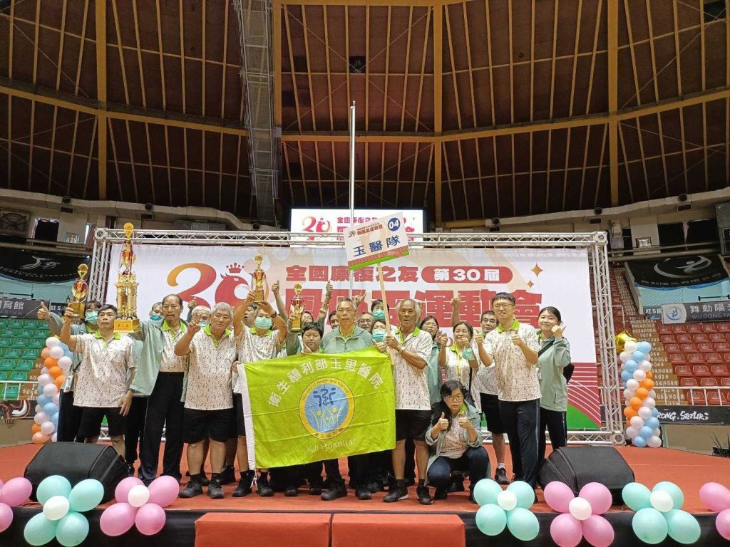 第30屆全國精神康復之友鳳凰盃運動會於10月24日在高雄鳳山體育館隆重舉行,來自全國26支隊伍的數百名康復者齊聚一堂,共同參與這場充滿熱血與希望的賽事。衛生福利部玉里醫院為爭取榮譽,由職能治療科李書齊主任率領20名復健菁英選手參賽,當日簡以嘉院長親自前往會場為選手們加油打氣,果然不負眾望,在全國26隊參賽者中勇奪競賽總成績第六名,個別成績有飛盤擲接第三名、藕斷絲連第六名、凌波微步第六名,亮眼成績再度呈現玉里醫院的復健成果。